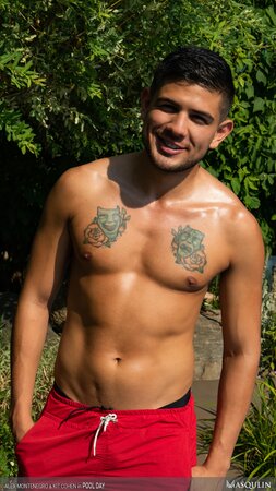Kit Cohen strips trunks to show beefy body while Alex Montenegro tans in black Speedo